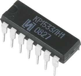 КР1533ЛН1 (00-16г), 6 логических элементов «НЕ» (SN74ALS04AN)Стандартные серии ТТЛ: 1533, КР1533. Время задержки 4 нс, мощность потребления 4 мВт/вентиль